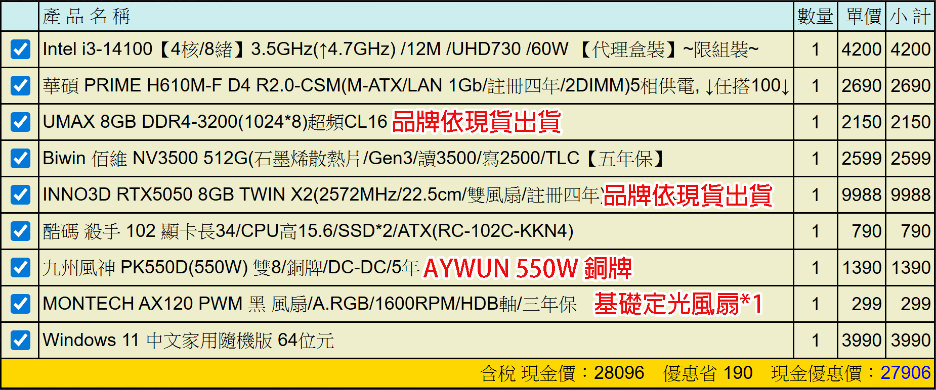 備註因電腦零件汰換很快 會根據情況因缺貨或時關係有可能 更換/升級 同等價值不同廠牌零件