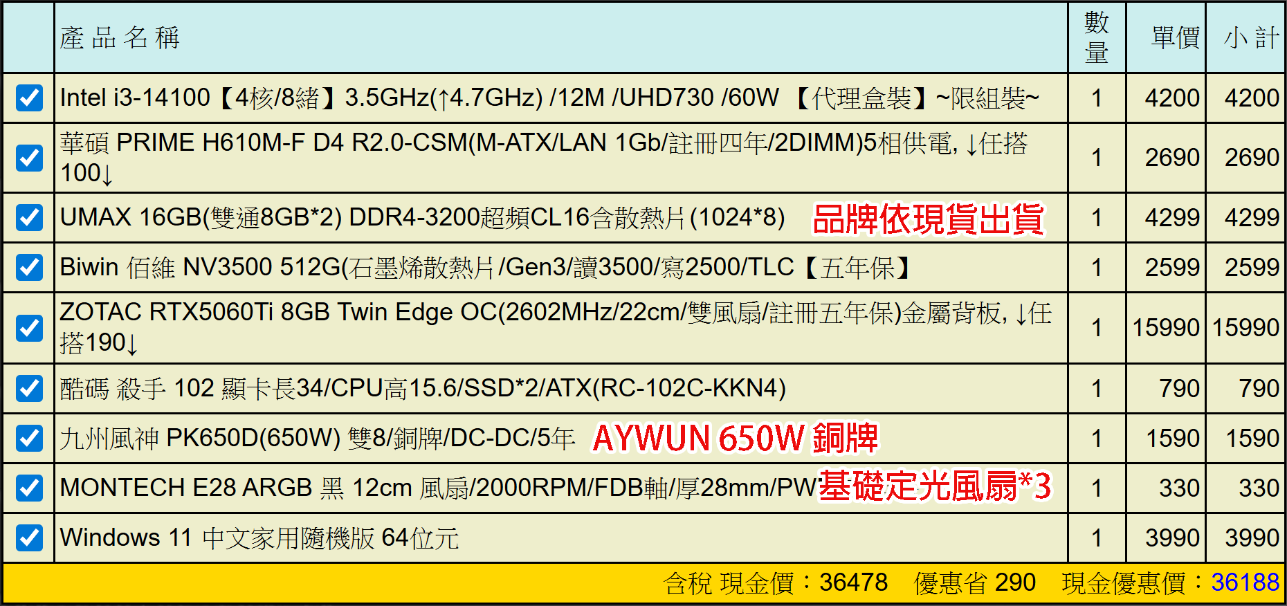 備註: 因電腦零件汰換很快 會根據情況因缺貨或時關係有可能 更換/升級 同等價值不同廠牌零件