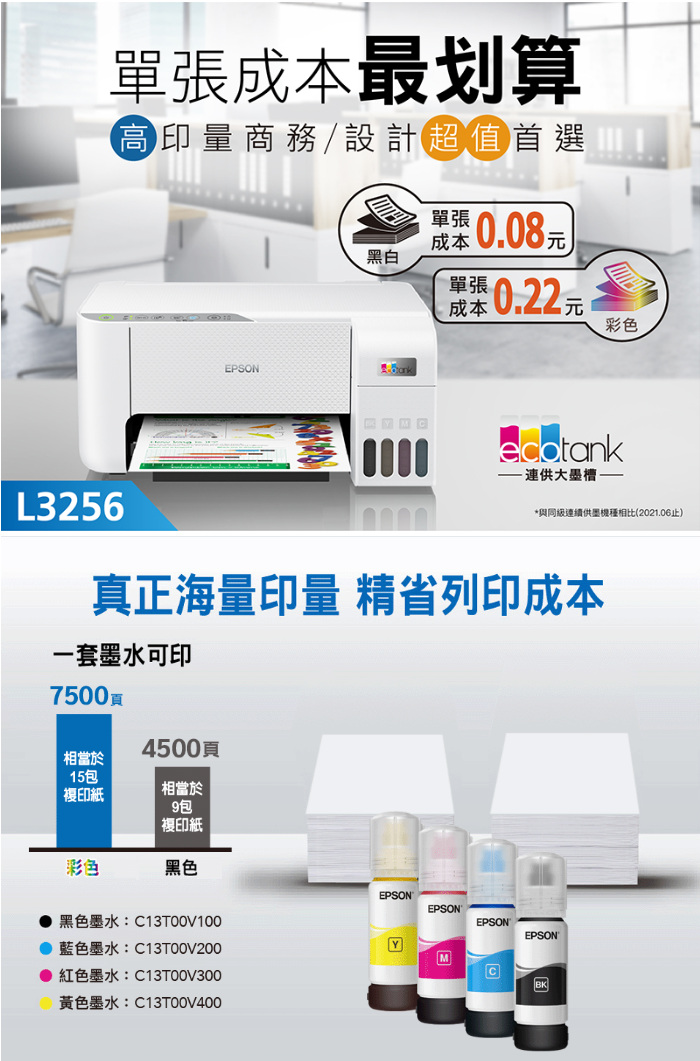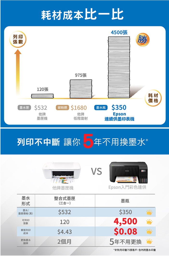 【省】黑墨印量達4,500張,彩色7,500張,一瓶墨水只要350元