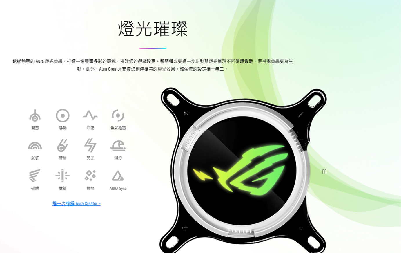 高級 ROG ARGB 風扇,具有高風量、低噪音和 0dB 技術。