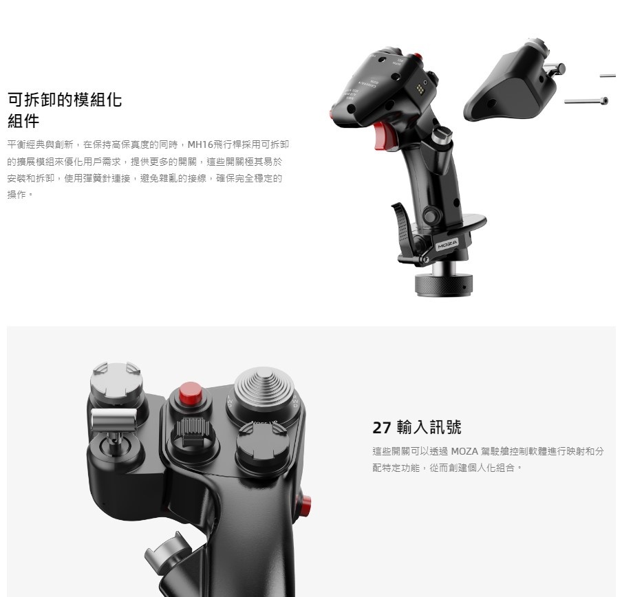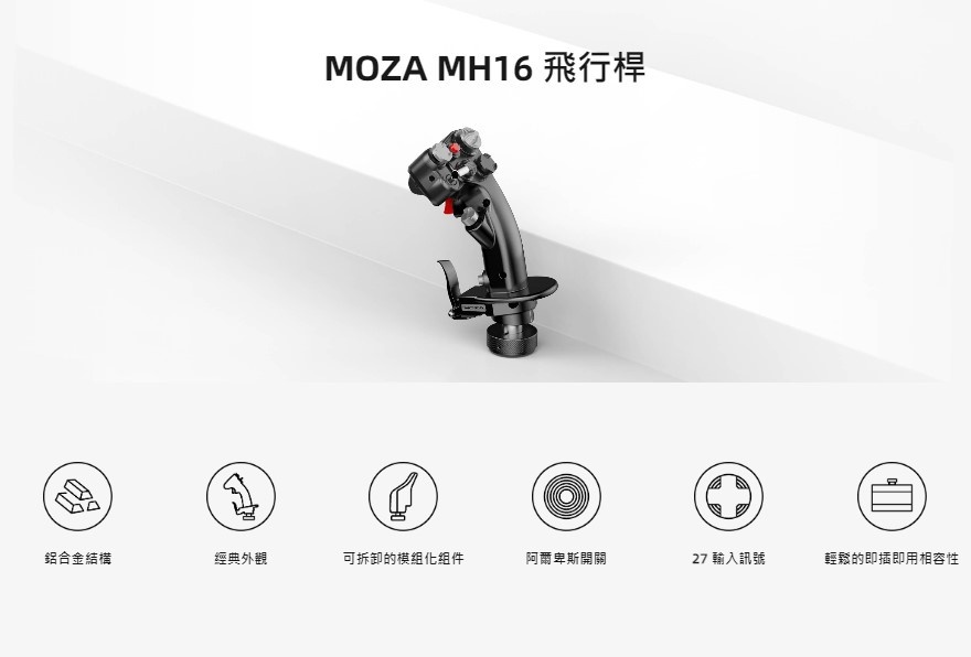 採用航空級鋁合金和汽車級油漆製成,具有卓越的耐用性和經典的戰鬥機設計。它具有可拆卸的模組化組件,帶有彈簧針連接,易於安裝和穩定運行,提供額外的開關而無需凌亂的接線。 MH16 具有 27 個輸入訊號和 8 路 ALPS 操縱桿,允許透過 MOZA 駕駛艙控制軟體進行廣泛的客製化。輕鬆的即插即用相容性確保它無縫適合大多數基地,提供真實可靠的飛行體驗。