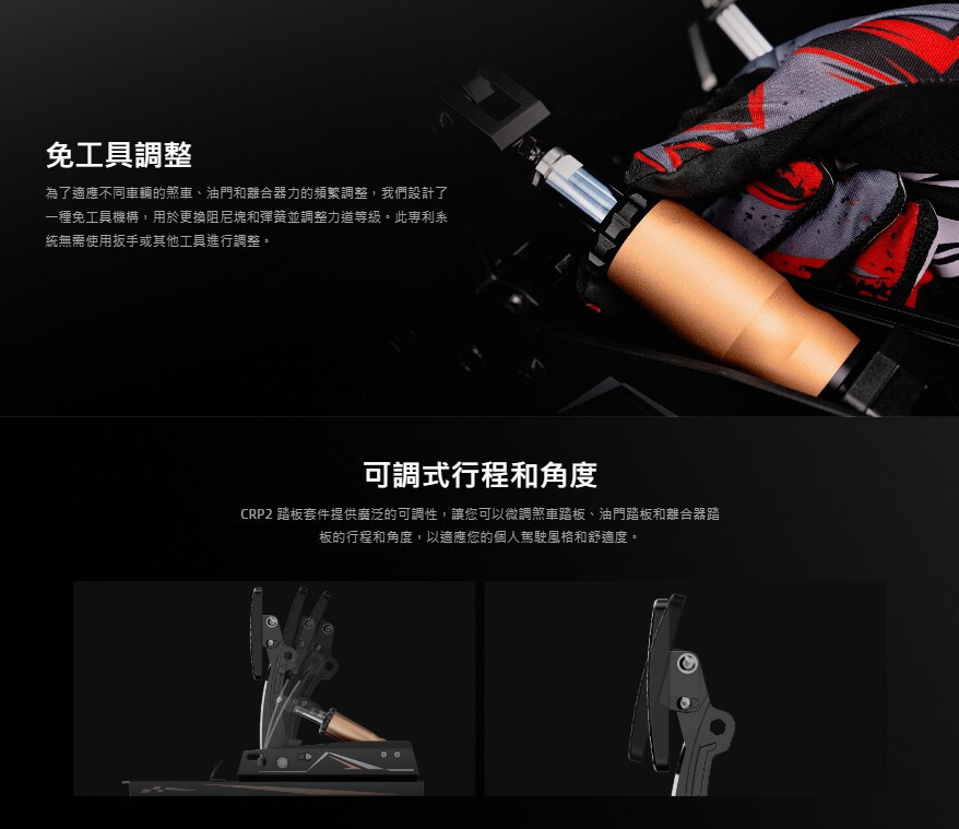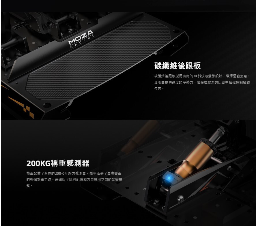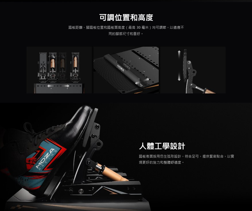 MOZA 隆重推出 MOZA CRP2 壓力感測踏板,這些踏板由 CNC 航空級鋁製成,配有碳纖維腳跟板,具有無與倫比的精度和耐用性。 CRP2 配備 200 公斤稱重感測器和 15 位元高精度角度感測器,可提供準確、靈敏的煞車感覺,並具有多達 1,764 個客製化選項,可適應從公路車到 F1 級性能的各種需求。免工具調節系統確保快速、輕鬆的調節,而其時尚、簡約的設計可無縫整合到任何模擬賽車設定中。 CRP2 踏板支援倒置安裝並與 PC 和 Xbox 系統完全相容,專為尋求專業級性能的嚴肅模擬賽車手而設計。