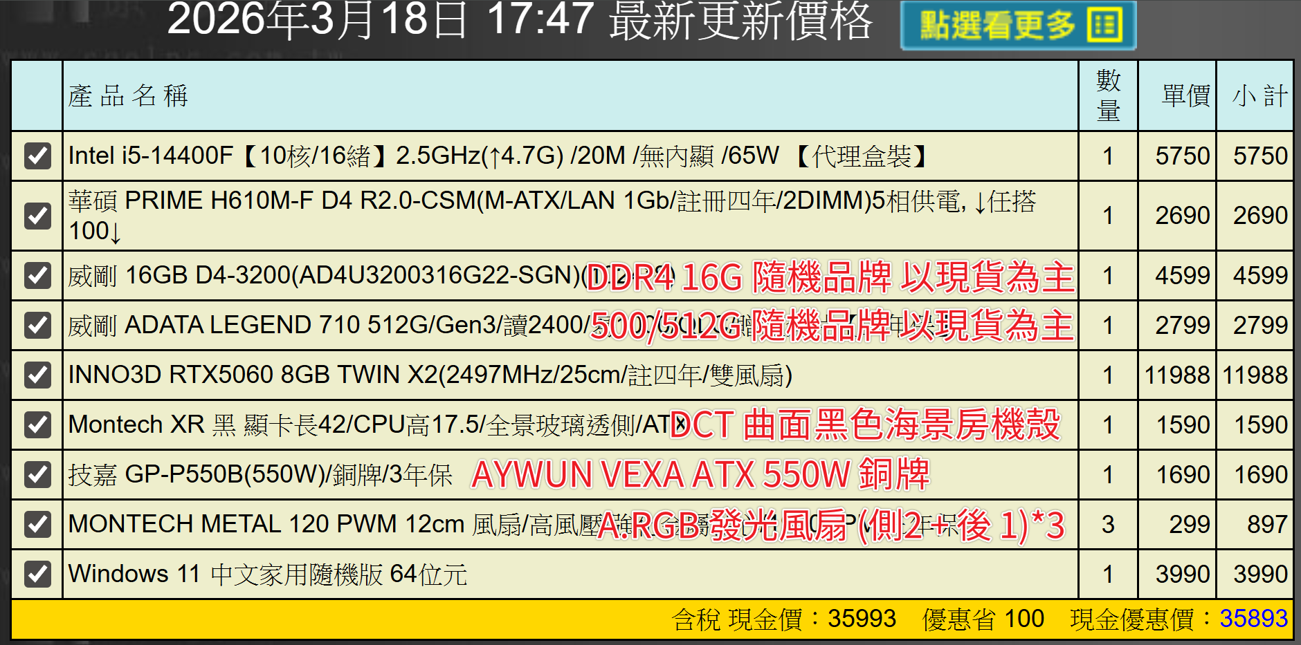 備註: 因電腦零件汰換很快 會根據情況因缺貨或時關係有可能 更換/升級 同等價值不同廠牌零件