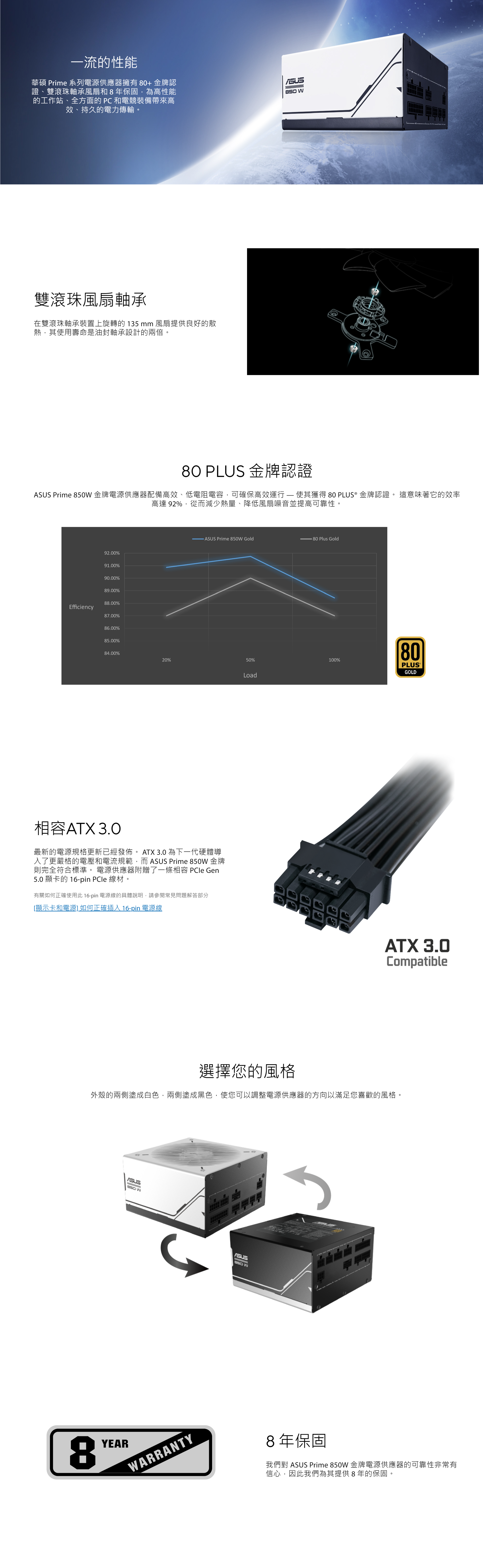 雙8/金牌/全模組/ATX3.0(PCIe 5.0)/雙滾珠風扇/8年保