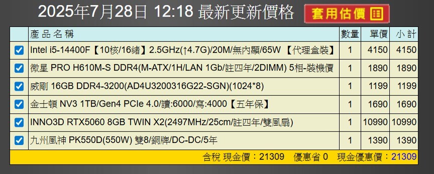 效能B - 詳細規格配置⭐[ C P U ] INTEL 14400F ( 海外平輸 / DCT保固3年 ) | AMD R5 5600X⭐[ 主 機 板 ] MSI PRO H610M-S DDR4 | 華碩 PRIME A520M-K/CSM⭐[ 記 憶 體 ] 16G D4 3200 單條 無馬甲 ( 升級選項 16GB(8*2) RGB | 32GB(16*2) 無馬甲 | 32GB(16*2) RGB )⭐[ 硬 碟 ] NV3 500GB/Gen4 PCIe 4.0 ( 升級選項 1TB | 高速SSD 1TB | 2TB 慢速 )⭐[ 顯 示 卡 ] INNO3D / PNY RTX5060 8GB ( 升級選項 DUAL 5060 /PRIME 5060 )⭐[ 電 供 ] AYWUN VEXA ATX 550W 銅牌 ( 升級選項 ROG STRIX 550G 550W 金牌 )原價屋單參考圖*********************************************