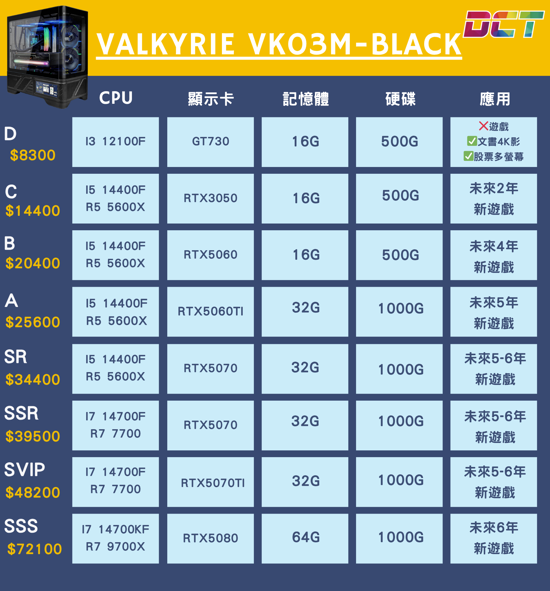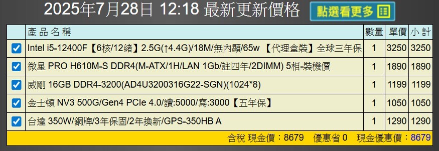 效能D - 詳細規格配置⭐[ C P U ] INTEL 12100F ( 海外平輸 / DCT保固3年 )⭐[ 主 機 板 ] PRO H610M-S DDR4⭐[ 記 憶 體 ] 16G D4 3200 單條 無馬甲 ( 升級選項 16GB(8*2) RGB | 32GB(16*2) 無馬甲 | 32GB(16*2) RGB )⭐[ 硬 碟 ] NV3 500GB/Gen4 PCIe 4.0 ( 升級選項 1TB | 高速SSD 1TB | 2TB 慢速 )⭐[ 顯 示 卡 ] NVIDIA GT730 2GB ( 海外平輸 / DCT保固1年 )⭐[ 電 供 ] AYWUN VEXA ATX 550W 銅牌 ( 升級選項 ROG STRIX 550G 550W 金牌 )原價屋單參考圖*********************************************效能C - 詳細規格配置⭐[ C P U ] INTEL 14400F ( 海外平輸 / DCT保固3年 ) | AMD R5 5600X⭐[ 主 機 板 ] MSI PRO H610M-S DDR4 | 華碩 PRIME A520M-K/CSM⭐[ 記 憶 體 ] 16G D4 3200 單條 無馬甲 ( 升級選項 16GB(8*2) RGB | 32GB(16*2) 無馬甲 | 32GB(16*2) RGB )⭐[ 硬 碟 ] NV3 500GB/Gen4 PCIe 4.0 ( 升級選項 1TB | 高速SSD 1TB | 2TB 慢速 )⭐[ 顯 示 卡 ] ZOTAC / INNO3D RTX3050 6GB ( 升級選項 ASUS RTX3050 | INNO3D 5050 )⭐[ 電 供 ] AYWUN VEXA ATX 550W 銅牌 ( 升級選項 ROG STRIX 550G 550W 金牌 )原價屋單參考圖