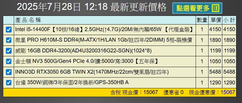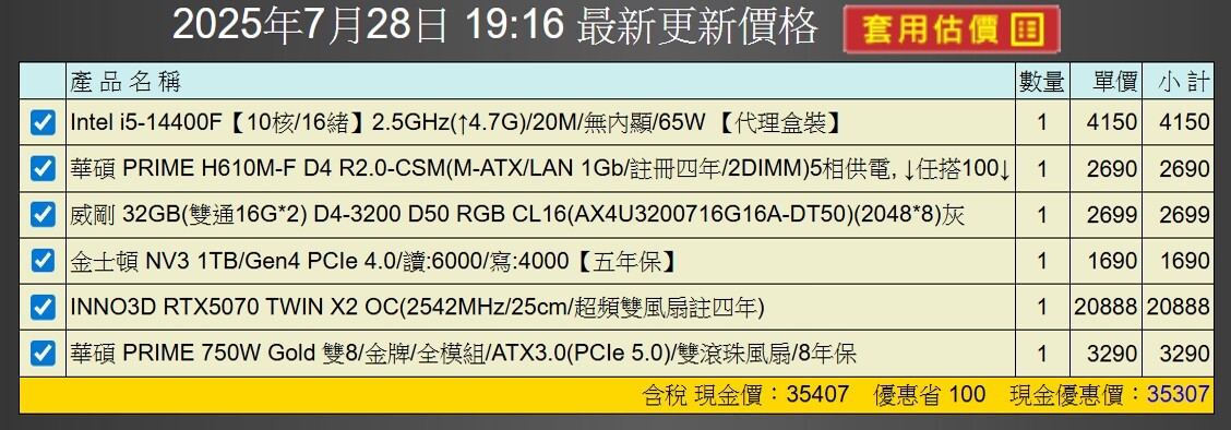 *********************************************效能SR - 詳細規格配置⭐[ C P U ] INTEL 14400F ( 海外平輸 / DCT保固3年 ) | AMD R5 5600X⭐[ 主 機 板 ] ASUS H610M-F DDR4 | 華碩 PRIME A520M-K/CSM⭐[ 記 憶 體 ] 威剛 32GB(雙通16G*2) D4-3200/CL16 D50 RGB⭐[ 硬 碟 ] NV3 1000GB/Gen4 PCIe 4.0⭐[ 顯 示 卡 ] INNO3D RTX5070 12GB GDDR7 TWIN X2 OC (雙風扇) ( 升級選項 INNO3D RTX5070 12G X3 OC 三風扇 )⭐[ 電 供 ] 華碩 PRIME 750W Gold AP-750G ( 升級選項 華碩 PRIME 850W Gold(AP-850G | 1000W 一線品牌 電供 )原價屋單參考圖