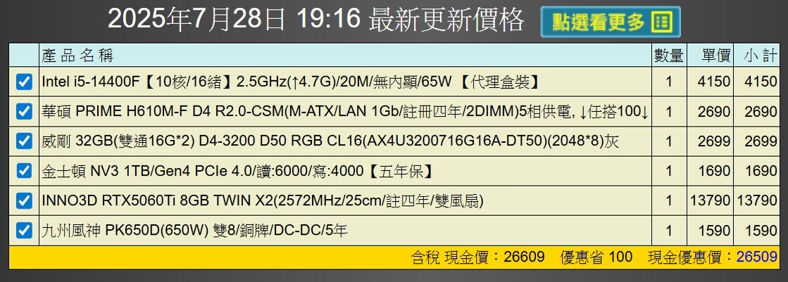 *********************************************效能A - 詳細規格配置⭐[ C P U ] INTEL 14400F ( 海外平輸 / DCT保固3年 ) | AMD R5 5600X⭐[ 主 機 板 ] ASUS H610M-F DDR4 | 華碩 PRIME A520M-K/CSM⭐[ 記 憶 體 ] 威剛 32GB(雙通16G*2) D4-3200/CL16 D50 RGB⭐[ 硬 碟 ] NV3 1000GB/Gen4 PCIe 4.0⭐[ 顯 示 卡 ] DUAL RTX5060TI O8G (雙風扇) ( 升級選項 PRIME RTX5060TI O8G | DUAL RTX5060TI O16G )⭐[ 電 供 ] YAMA FORCE 650W 銅牌 ( 升級選項 華碩 PRIME 750W Gold(AP-750G) | ROG STRIX 650G 650W 金牌 )原價屋單參考圖