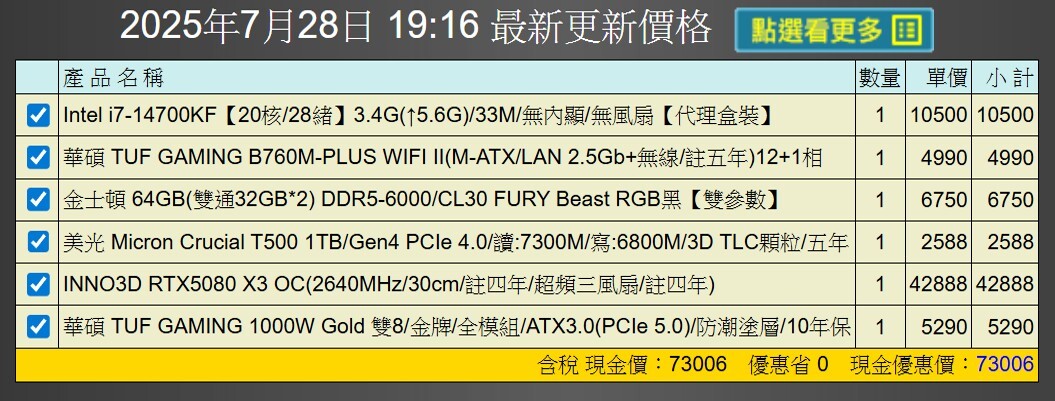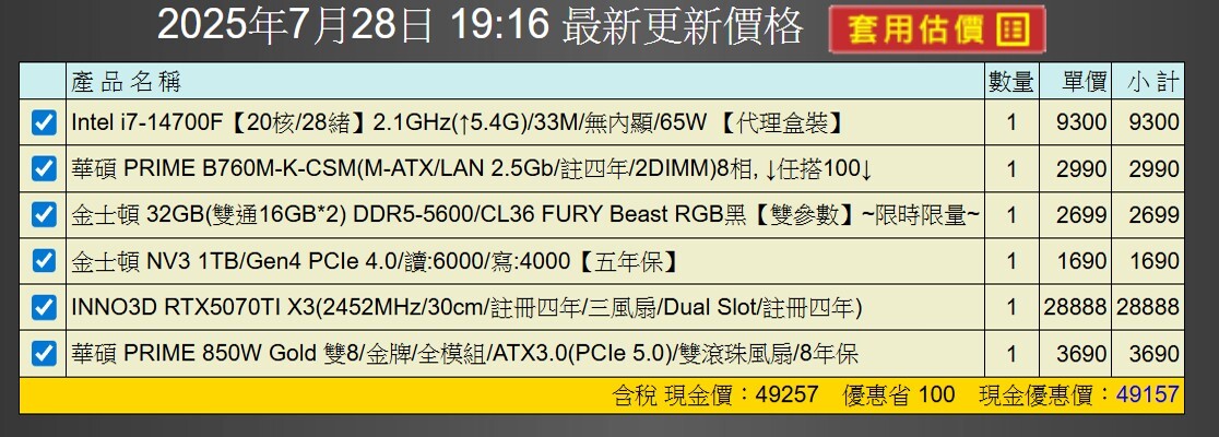 *********************************************效能SVIP - 詳細規格配置⭐[ C P U ] R7 7700 MPK⭐[ 主 機 板 ] B650M-AYW WIFI⭐[ 記 憶 體 ] 金士頓 32GB(雙通16GB*2) DDR5-5600/CL36 FURY Beast RGB⭐[ 硬 碟 ] NV3 1000GB/Gen4 PCIe 4.0⭐[ 顯 示 卡 ] INNO3D RTX5070TI X3 16GB (三風扇) ( 升級選項 PRIME RTX5070TI O16G )⭐[ 電 供 ] 華碩 PRIME 850W Gold AP-850G ( 升級選項 1000W 一線品牌 電供 | ROG THOR 850P2 850W 5600元 )原價屋單參考圖