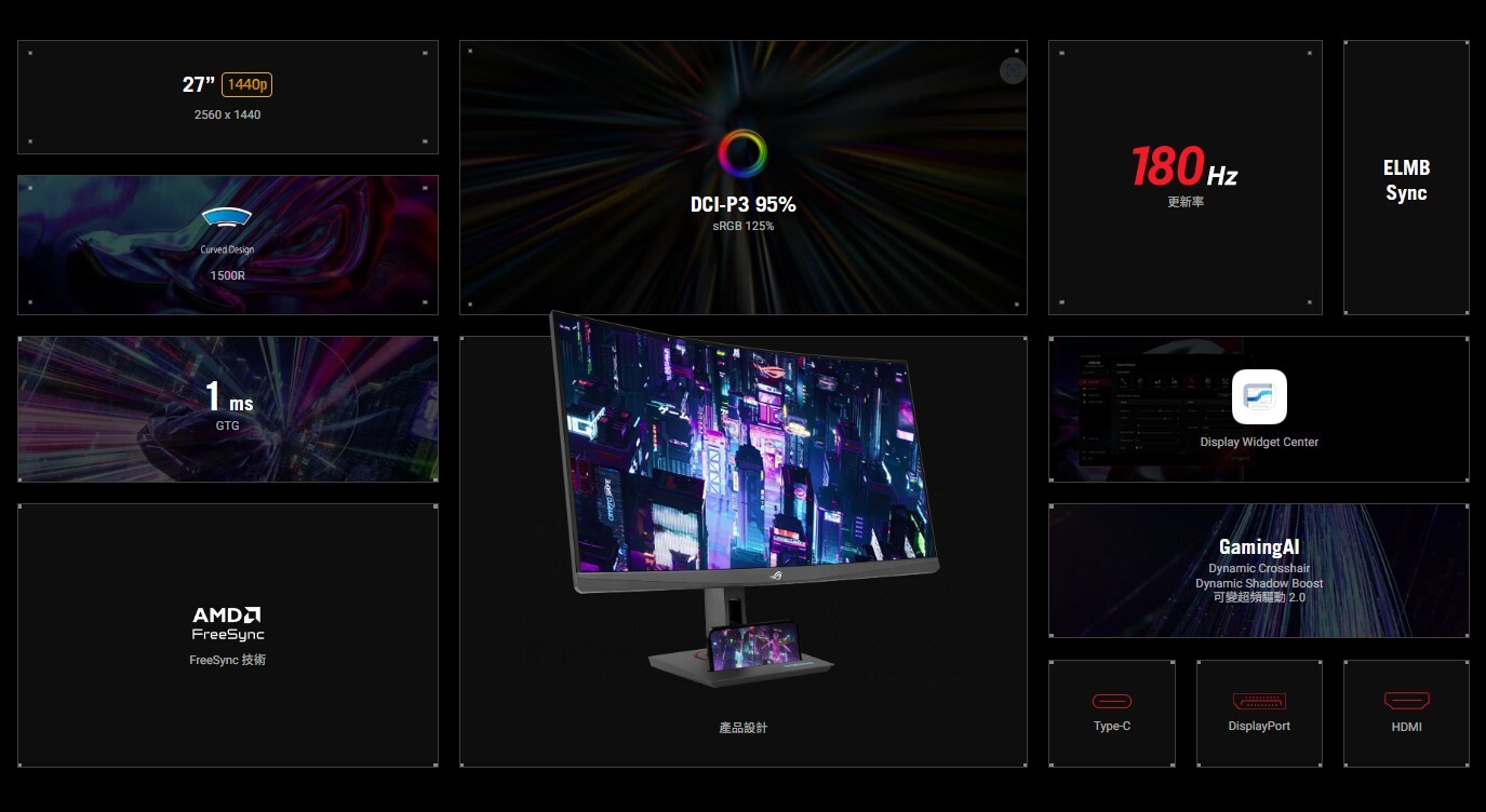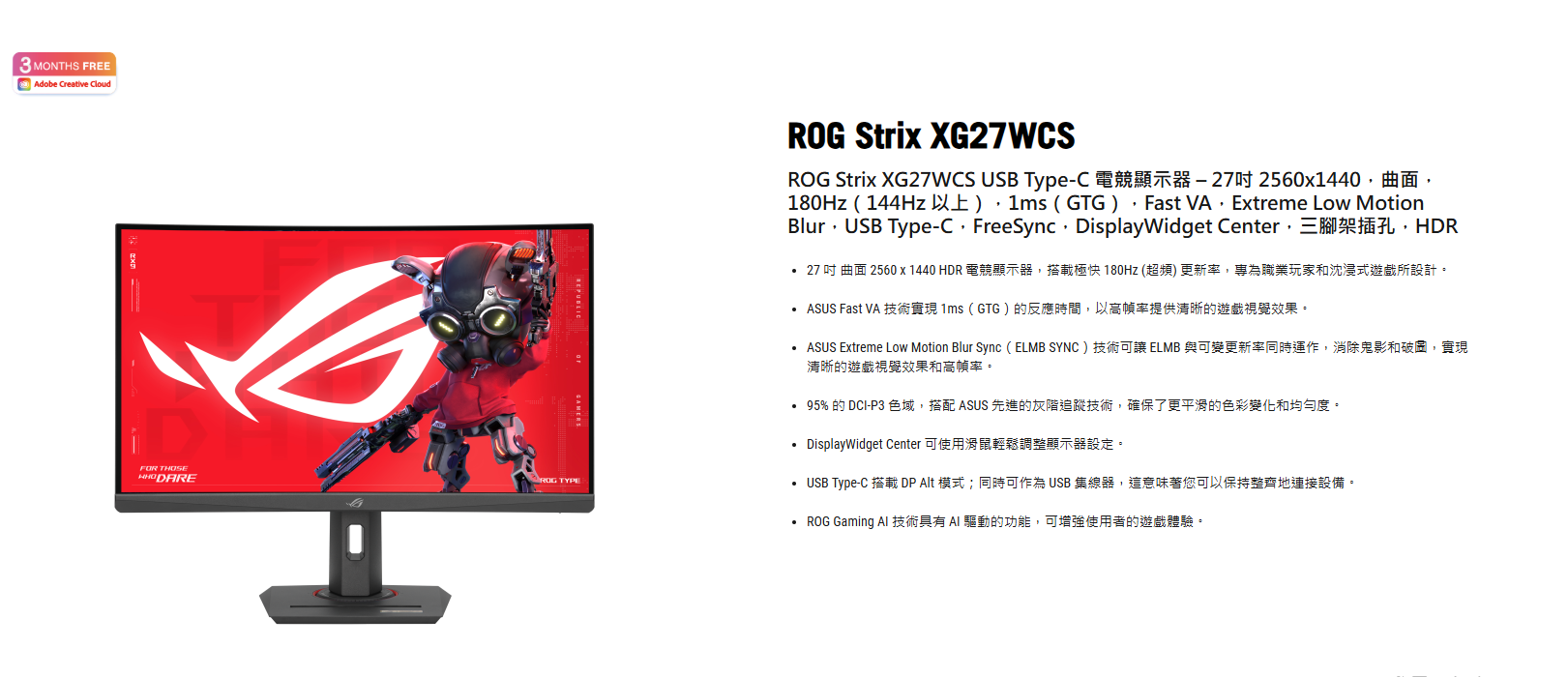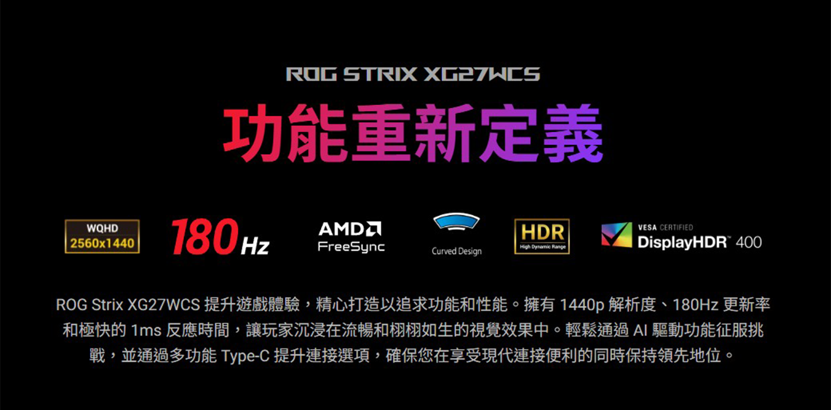 ROG Strix XG27WCS 27型 2K 180Hz HDR400 曲面
