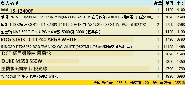 中壢I5-13400F+INNO3D RTX5060白展示機(新月白01)