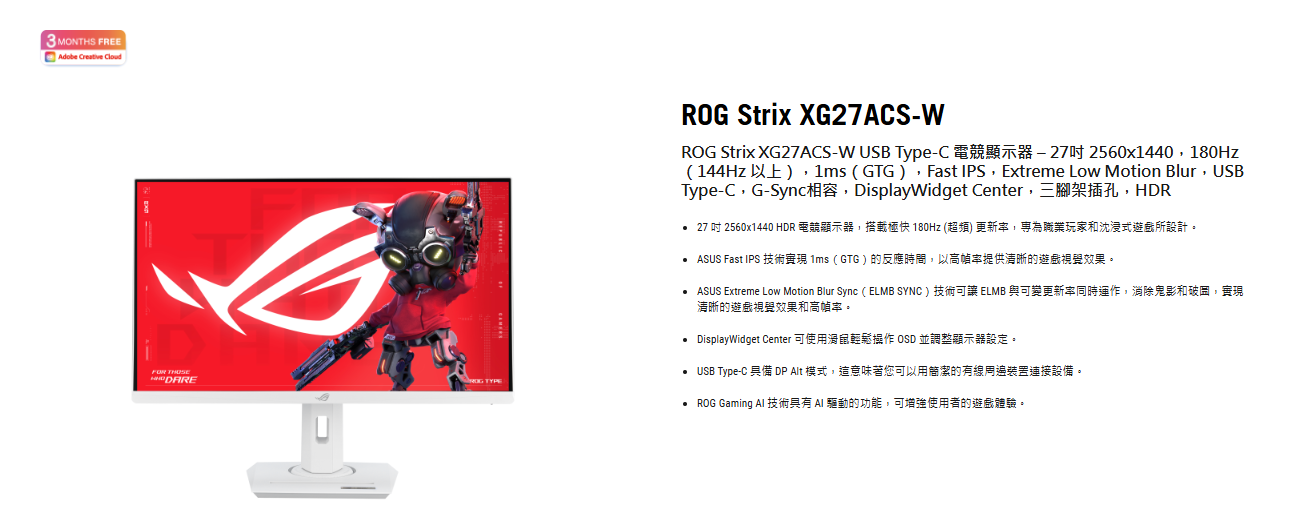 華碩 ROG Strix XG27ACS-W〈1H1P1C/IPS/180Hz/HDR400/白色〉