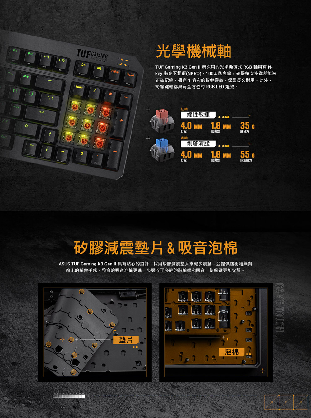 特色:具有100%防鬼鍵,1億次按鍵壽命,以及RGB LED提供全方位的按鍵燈光